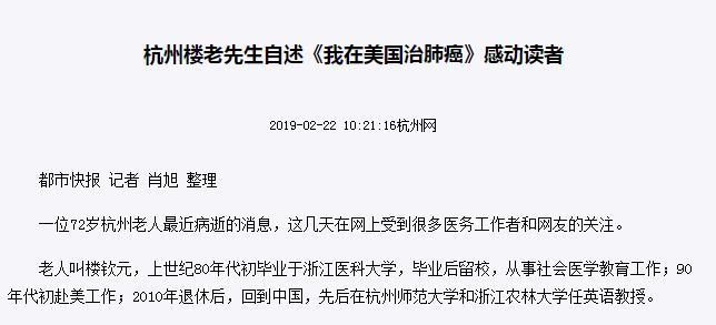 2、杭州网杭州楼老先生自述《我在美国治肺癌》感动读者